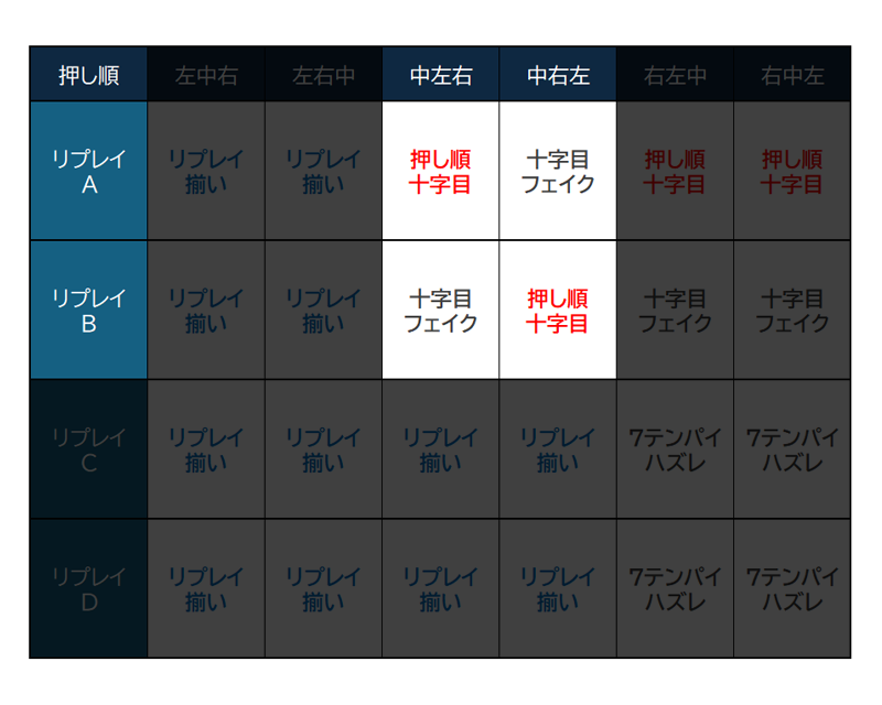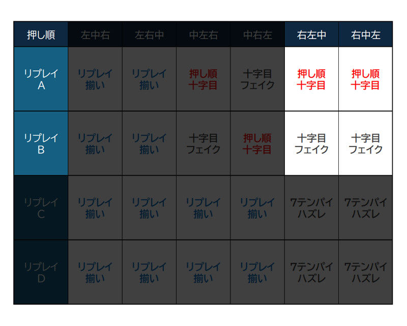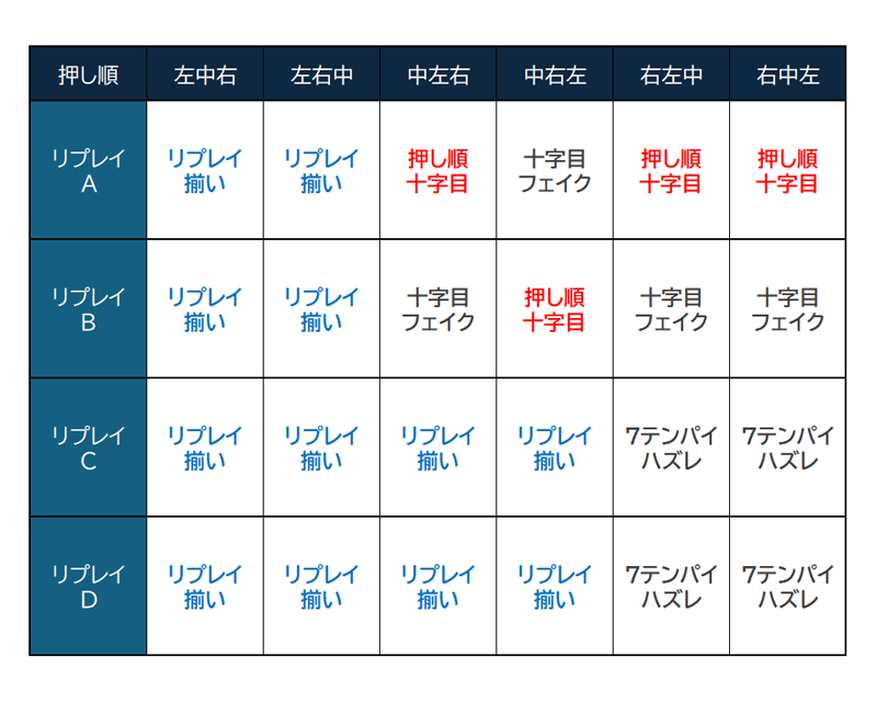 では左から押した場合はどうなるのか!?もうお気付きの方もいるかもしれませんが、停止した出目を参照して成功/失敗を決めているので、左リールから押した場合は『リプレイが揃うため失敗扱い』となります…