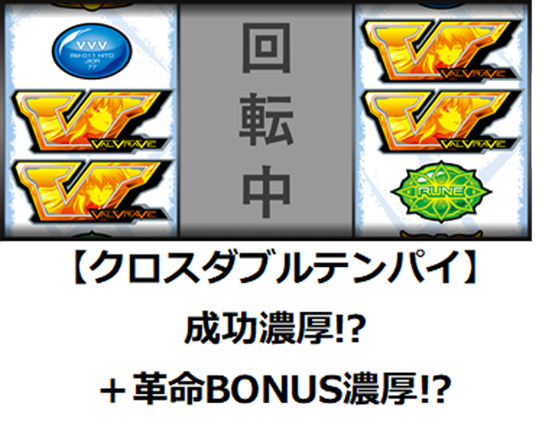 2G目のV図柄の準備目の停止形に法則があり、クロスのダブルテンパイからの成功で革命BONUS濃厚!?となります。