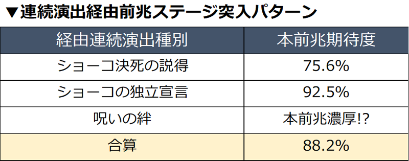 また、連続演出失敗を経由して前兆ステージへ移行した際のチャンスゾーン期待度は画像の通りです♪